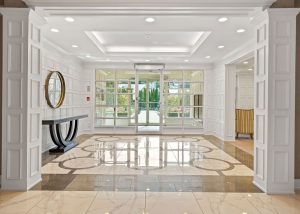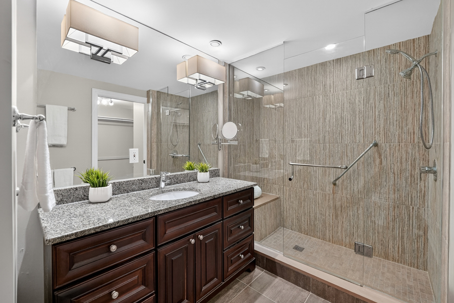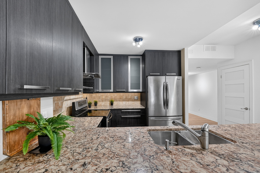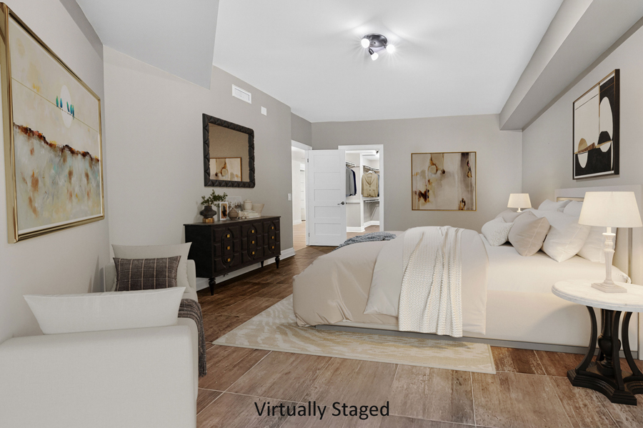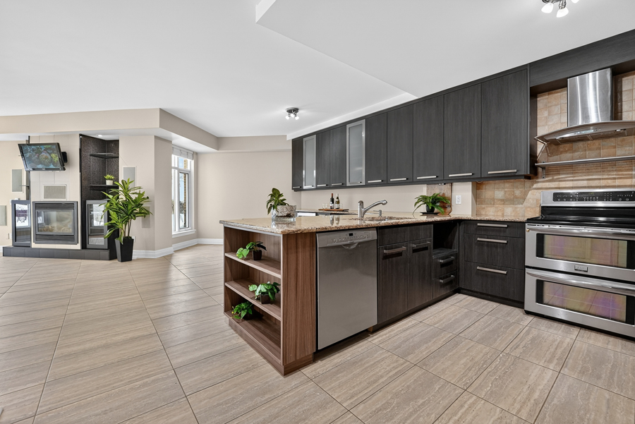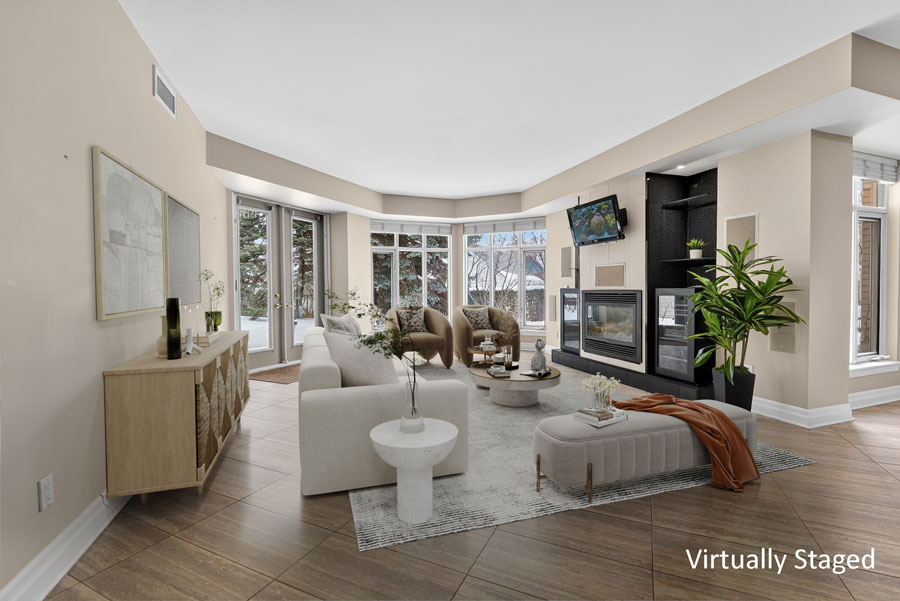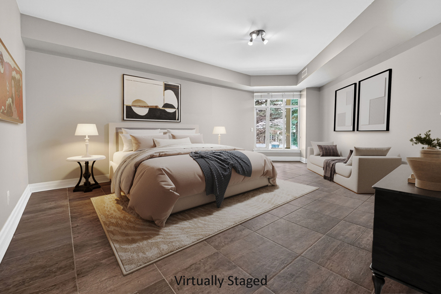 This upgraded ground floor 1,500 sq ft, 2 bed, 2 bath suite features a spacious living and dining area with a walk out to a large private terrace with a view of the Niagara River. A contemporary, open concept kitchen features over 20 ft of granite countertop with breakfast bar. Included are 9-foot ceilings, gas fireplace, in-suite separate laundry closet, a large pantry and floor to ceiling windows. The primary bedroom offers an extra large walk in closet and ensuite with a large walk-in shower and linen closet. The second bedroom overlooks a private atrium and easily serves as a home office or den.